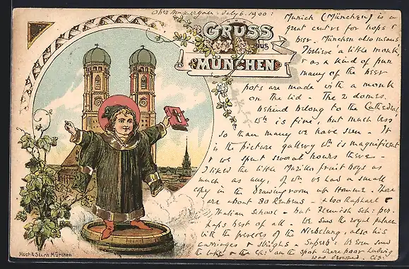 Lithographie München, Münchner Kindl, dahinter die Frauenkirche
