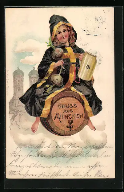 Lithographie München, Münchner Kindl fliegt auf einem Bierfass, Im Hintergrund Frauenkirche