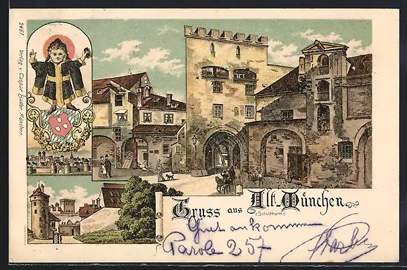 Lithographie München, Partie in Alt-München, Kindl, Wappen