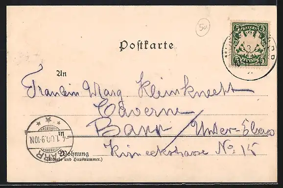 Personenbezogene Daten auf der Rückseite der Karte wurden durch blauen Textmarker unkenntlich gemacht. Die blauen Stellen sind auf die Vorderseite durchgeweicht und wirken sich negativ auf das Postkartenfoto aus