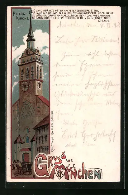 Lithographie München, Peterskirche mit Kutsche