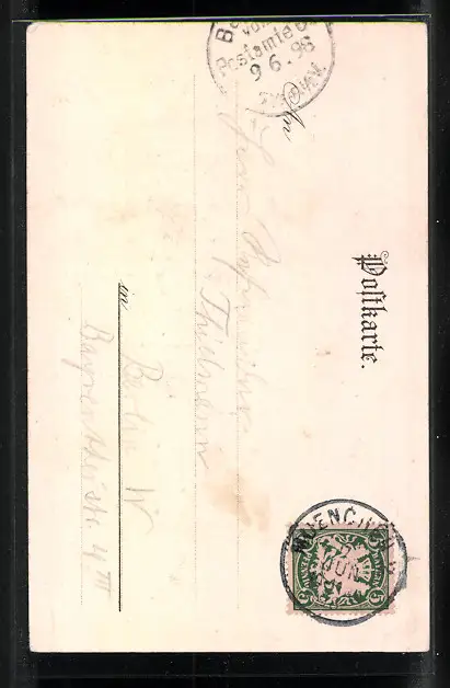 Personenbezogene Daten auf der Rückseite der Karte wurden durch blauen Textmarker unkenntlich gemacht. Die blauen Stellen sind auf die Vorderseite durchgeweicht und wirken sich negativ auf das Postkartenfoto aus