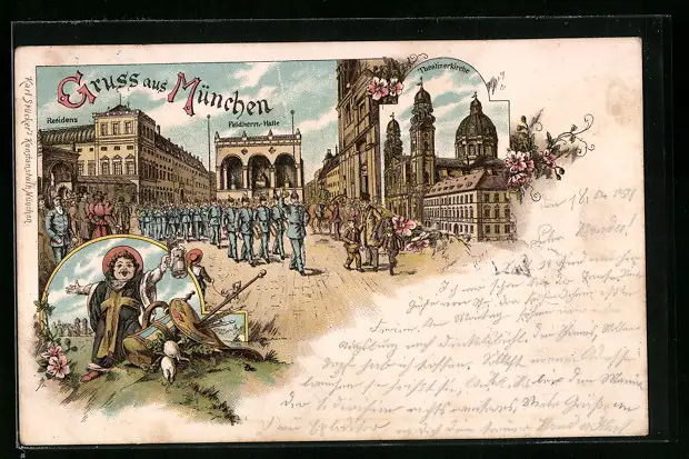 Lithographie München, Residenz, Feldherren-Halle und Theatinerkirche