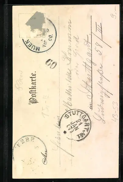 gelaufen 1900, Briefmarke entfernt, rückseitig Klebe- und Papierreste, rückseitig Oberflächenschaden, guter Zustand