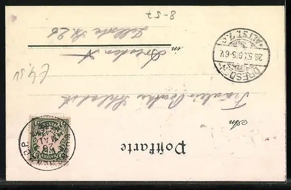 Personenbezogene Daten auf der Rückseite der Karte wurden durch blauen Textmarker unkenntlich gemacht. Die blauen Stellen sind auf die Vorderseite durchgeweicht und wirken sich negativ auf das Postkartenfoto aus