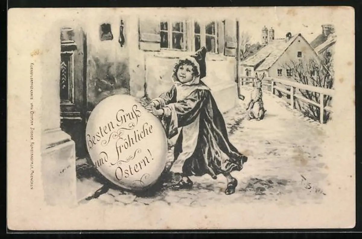Lithographie Münchner Kindl und der Osterhase bringen ein grosses Ei