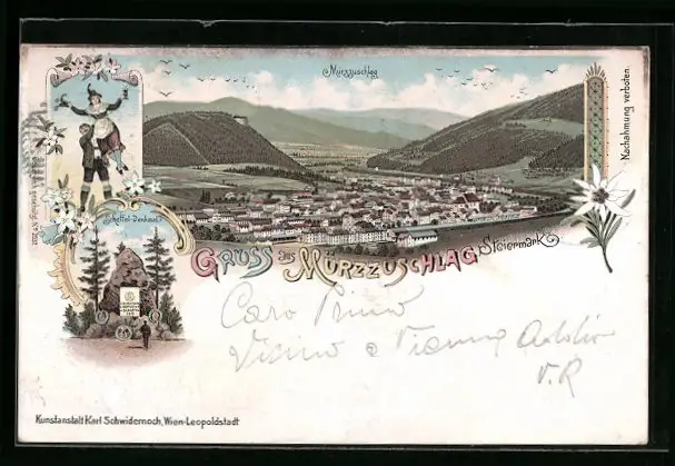 Lithographie Mürzzuschlag, Scheffel-Denkmal, Ortsansicht aus der Vogelschau