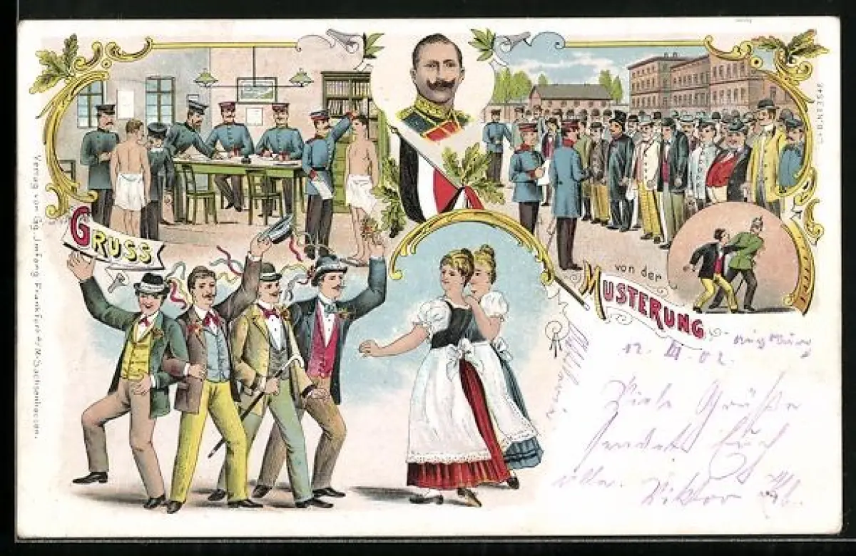 Lithographie Musterung, Begrüssung von Damen, Wilhelm II., Gruss von der Musterung