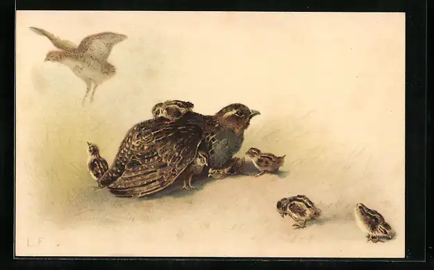 Lithographie Mutter beschützt ihre Kinder, Vogel