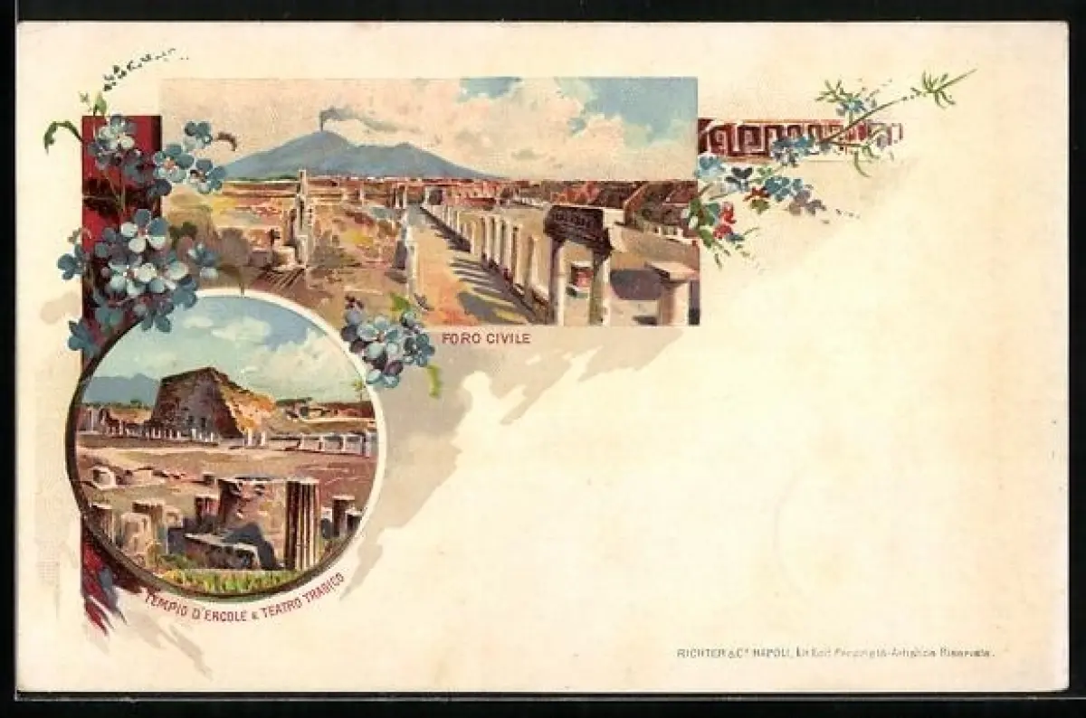 Lithographie Napoli, Foro Civile mit Blick auf den Vulkan Vesuv, Tempio d`Ercole e Teatro Tragico