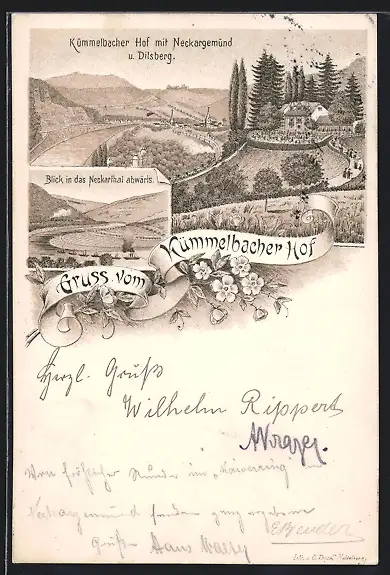 Lithographie Neckargemünd, Gasthaus Kümmelbacher Hof mit Dilsberg, Blick in das Neckarthal abwärts