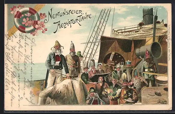 Lithographie Neptunsfeier, Aequator-Taufe, Bunte Gesellschaft auf einem Dampfer