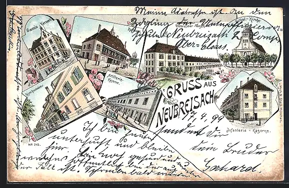 Lithographie Neubreisach, Artillerie-Kaserne, Infanterie-Kaserne, Unteroffizier-Vorschule und Kaiserl. Kommandantur