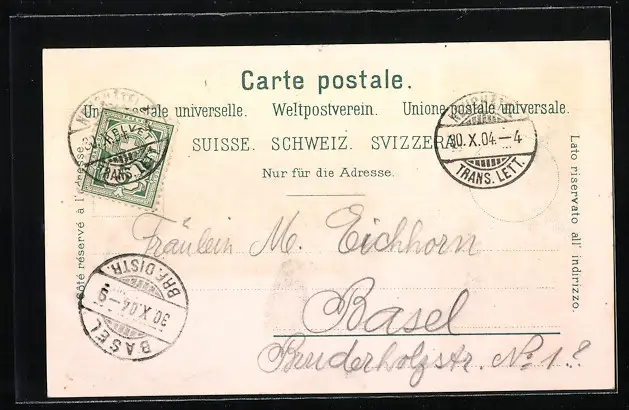 Personenbezogene Daten auf der Rückseite der Karte wurden durch blauen Textmarker unkenntlich gemacht. Die blauen Stellen sind auf die Vorderseite durchgeweicht und wirken sich negativ auf das Postkartenfoto aus