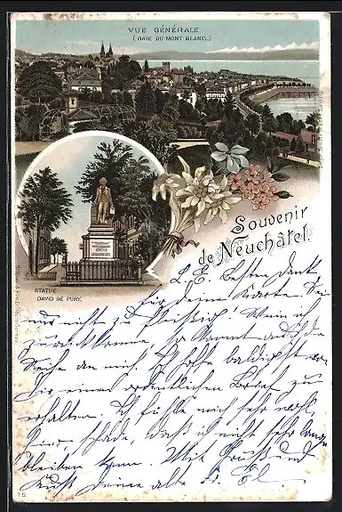 Lithographie Neuchâtel, Statue David de Pury, Vue Générale