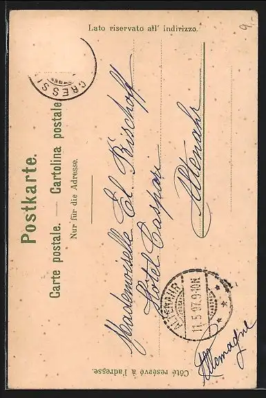 gelaufen 1897, Briefmarke entfernt, rückseitig Oberflächenschaden, guter Zustand