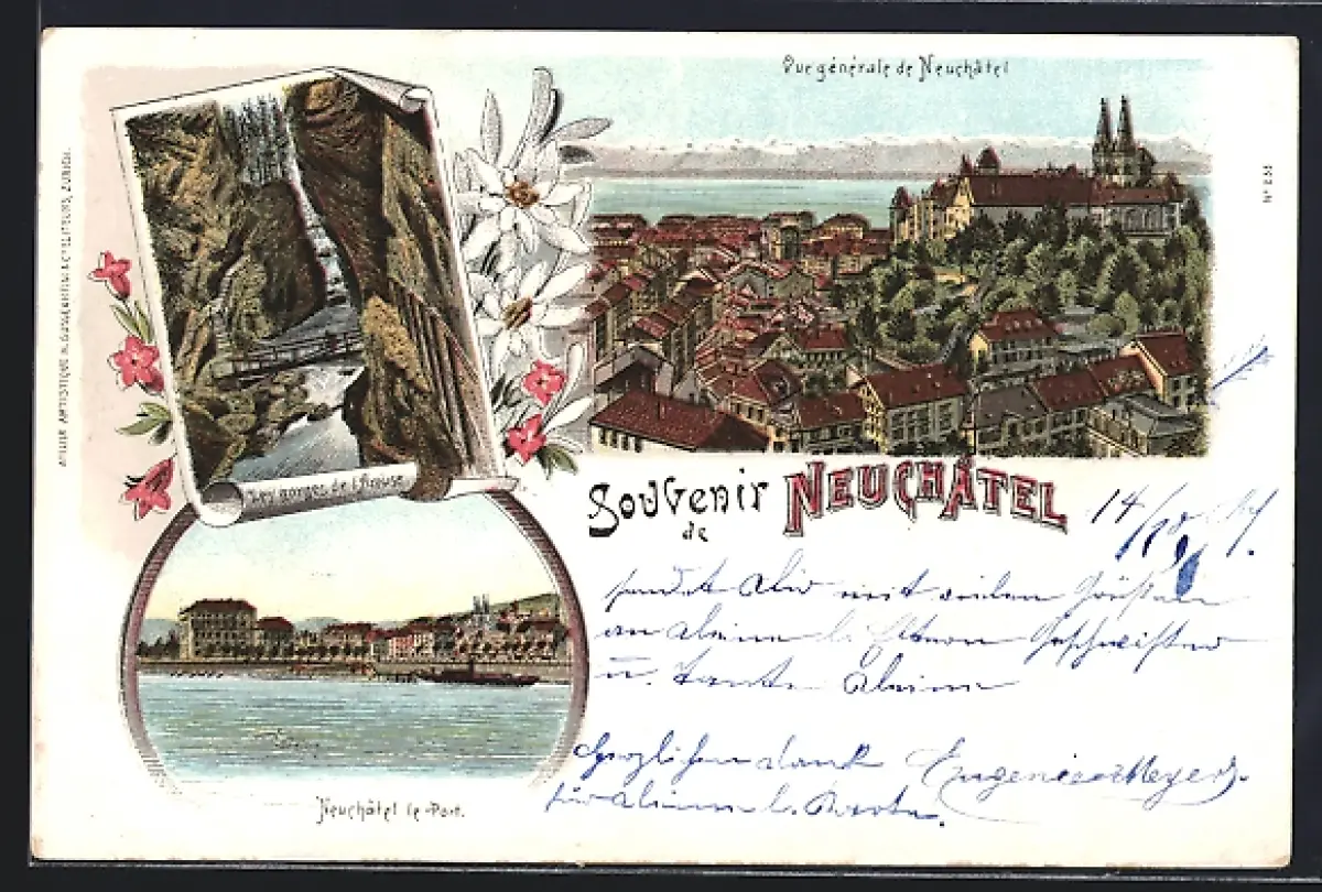 Lithographie Neuchatel, Vue générale, Le Port, Les Gorges de l`Areuse