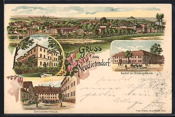 Lithographie Neudietendorf, Gasthof der Brüdergemeinde, Mädchen-Pensionat, Schwesternhaus