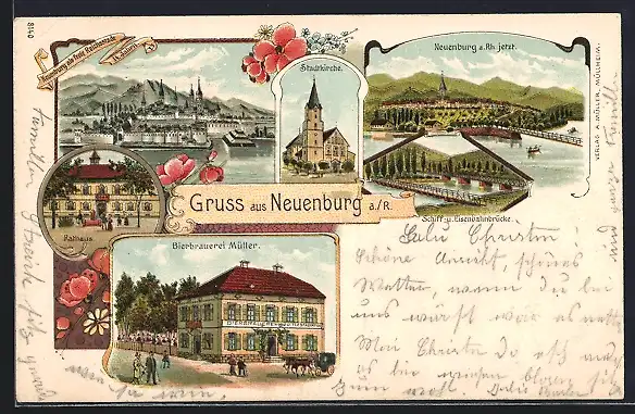 Lithographie Neuenburg a. R., Stadtkirche, Bierbrauerei Müller, Rathaus, Eisenbahnbrücke, Ortsansicht