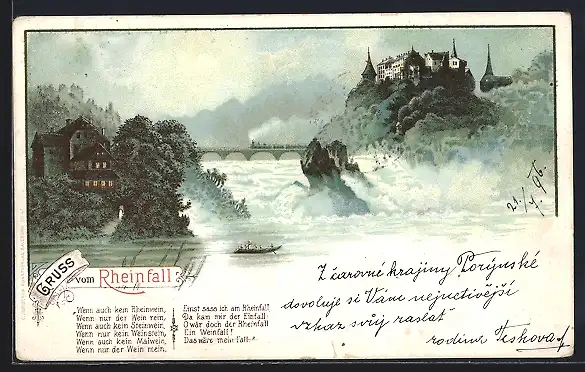 Lithographie Neuhausen am Rheinfall, Ortsansicht mit dem Rheinfall