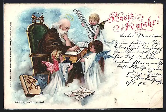 Lithographie Neujahrsengel helfen Petrus mit dem Wetterbericht