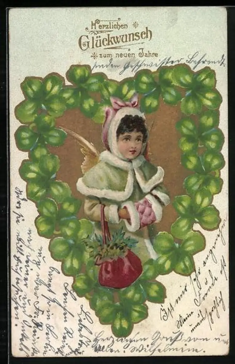 Lithographie Neujahrsengel in einem herzförmigen Rahmen aus Klee, Neujahr