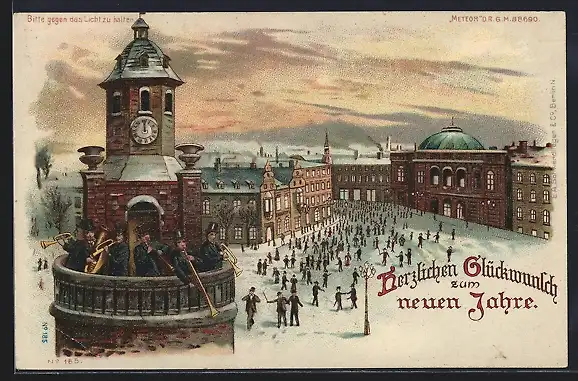 Lithographie Neujahrsgruss, Blaskapelle auf einem verschneiten Turm, Halt gegen das Licht