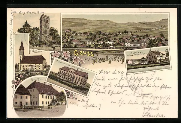 Lithographie Neukirch, Schule, König Johann Turm, Kirche
