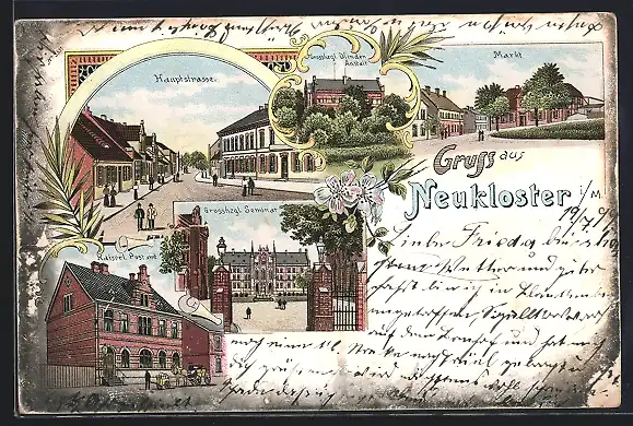 Lithographie Neukloster / M., Grossherzogl. Blinden-Anstalt, Hauptstrasse, Grossherzogl. Seminar, Kaiserl. Postamt, Markt
