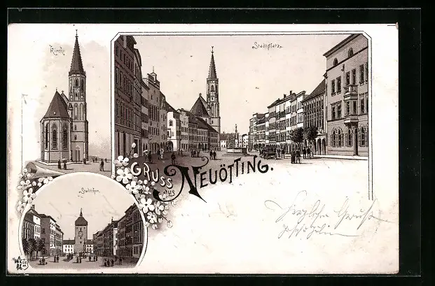 Lithographie Neuötting, Kirche Stadtthor, Stadtplatz