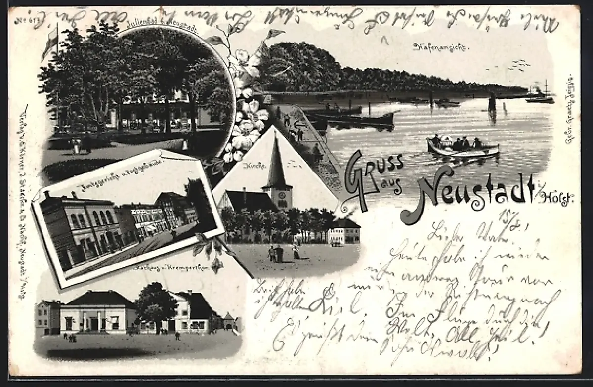 Lithographie Neustadt / Holstein, Cafe Julienbad, Amtsgericht und Post, Rathaus, Kirche