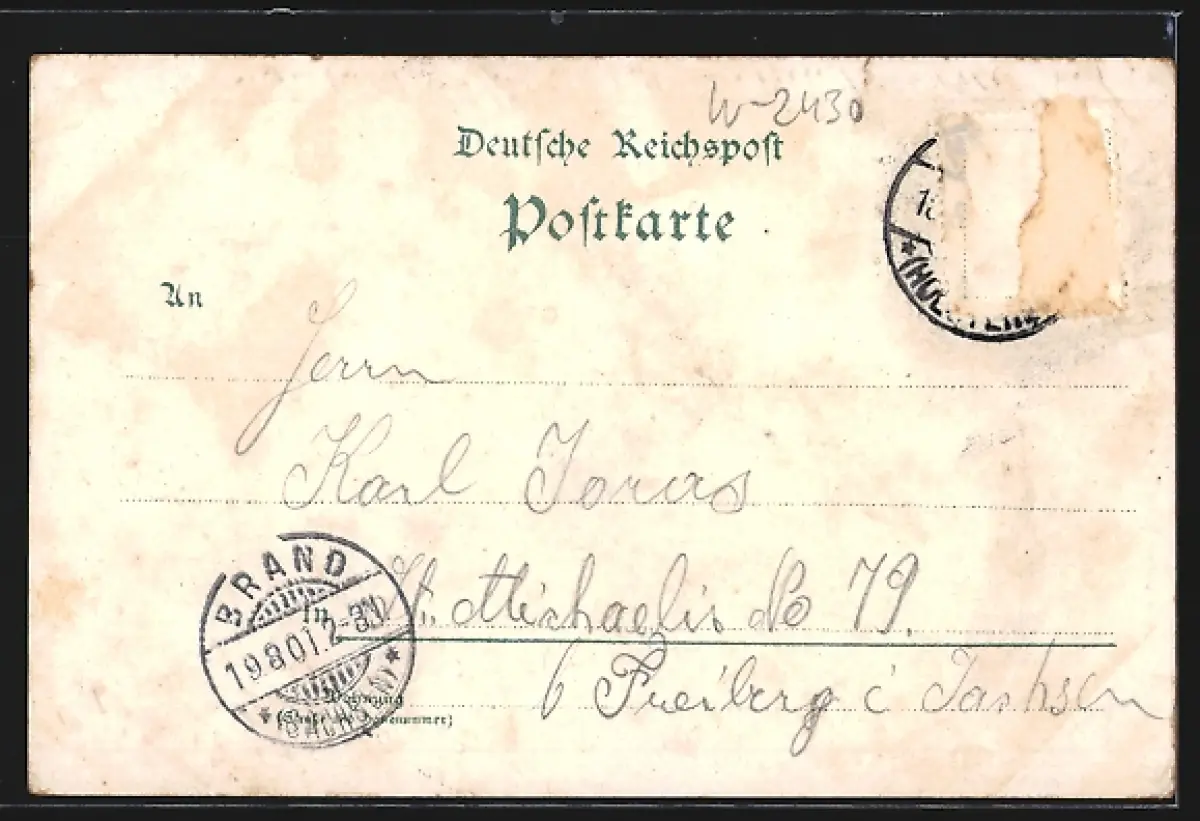 gelaufen 1901, Briefmarke entfernt, rückseitig Oberflächenschaden, guter Zustand
