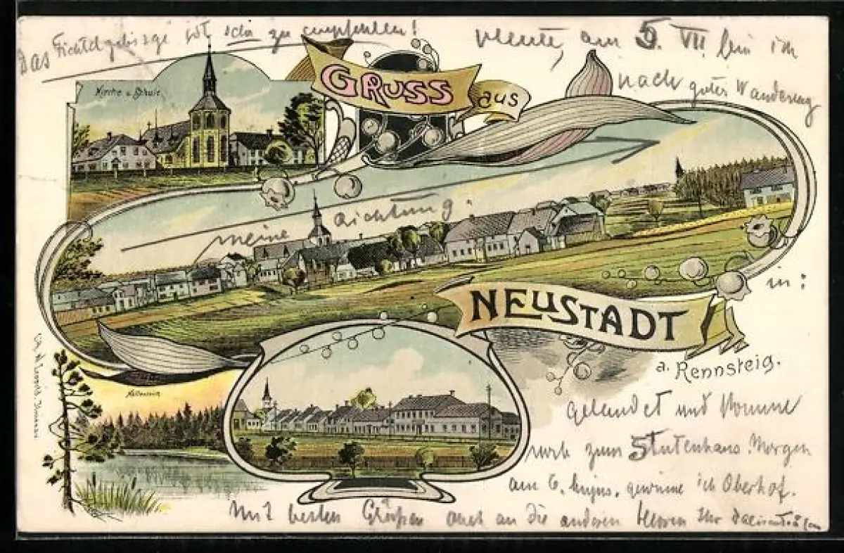 Lithographie Neustadt a. Rennsteig, Kirche, Schule, Ortsansicht