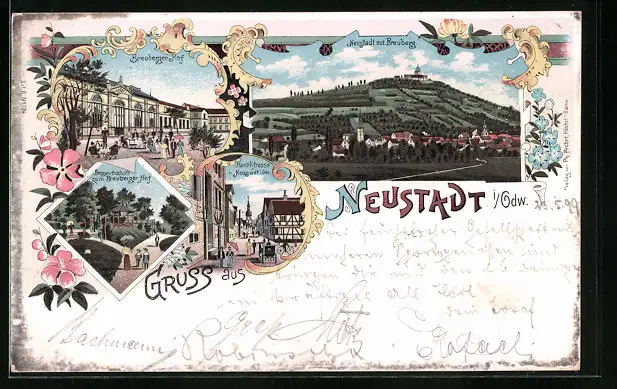 Lithographie Neustadt i. O., Gesamtansicht mit Hauptstrasse