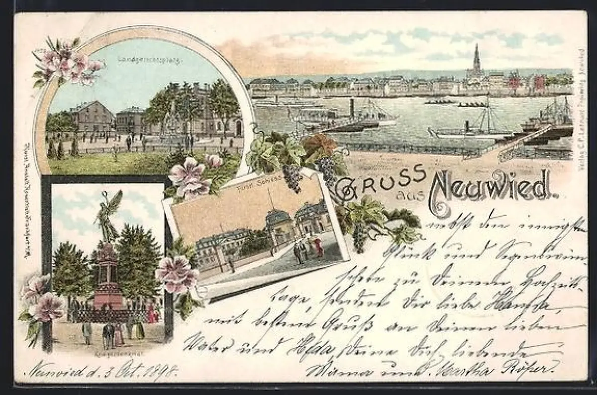 Lithographie Neuwied, Fürstliches Schloss, Landgerichtsplatz, Kriegerdenkmal