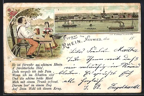 Lithographie Neuwied /Rhein, Dampfer und Segelboot passieren die Stadt, schwitzender Wanderer im Gasthaus