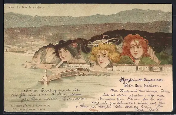 Lithographie Nice, Le Port et le château, Berg mit Gesicht / Berggesichter, Killinger Nr. 133