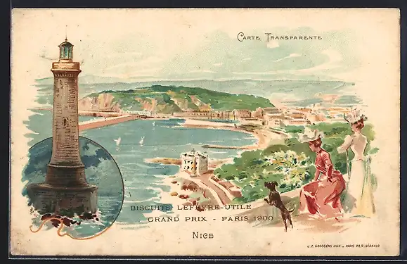 Lithographie Nice, Leuchtturm, Blick auf die Stadt, Gaufrettes Lu Biscuits, Halt gegen das Licht