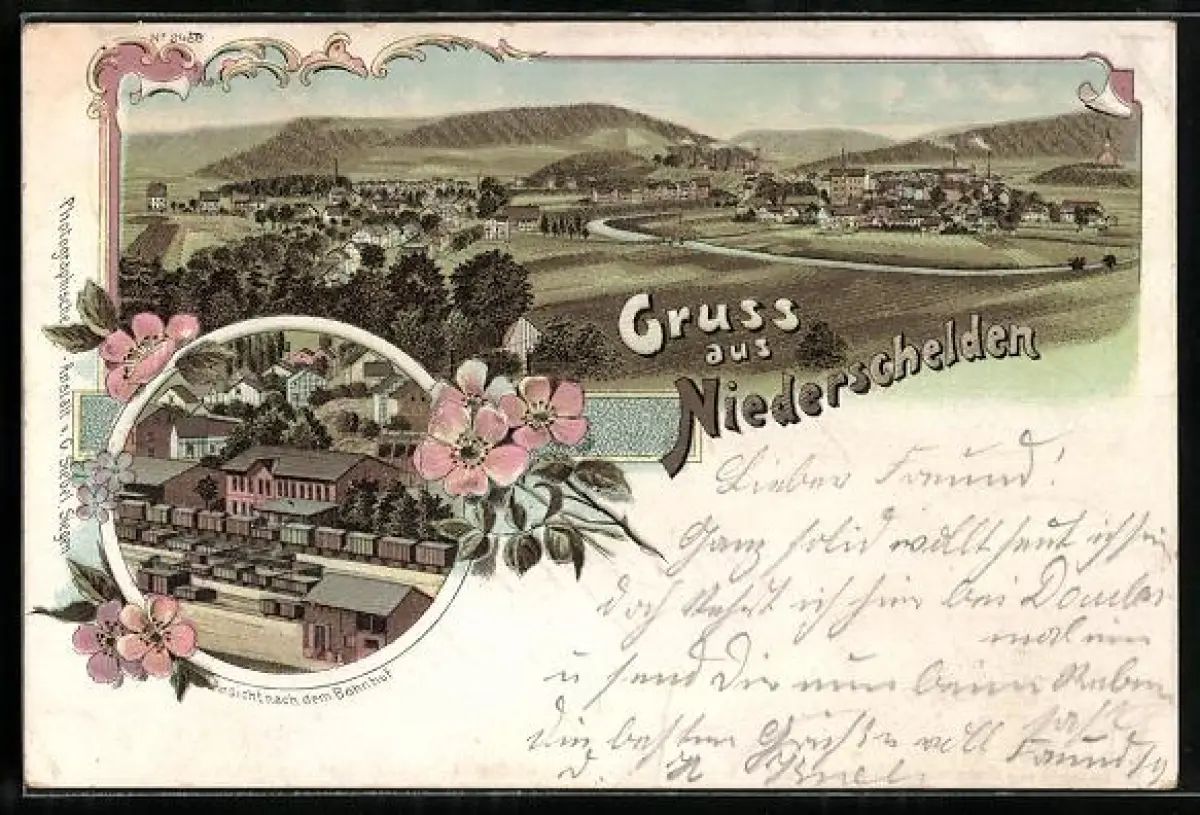 Lithographie Niederschelden, Gesamtansicht, Bahnhof