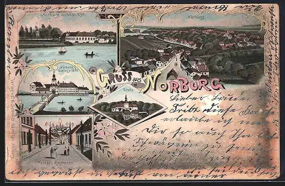 Lithographie Norburg, Feststr. Ringreiten, Schloss, Kirche und Totalansicht