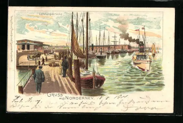 Lithographie Norderney, Landungsbrücke im Hafen