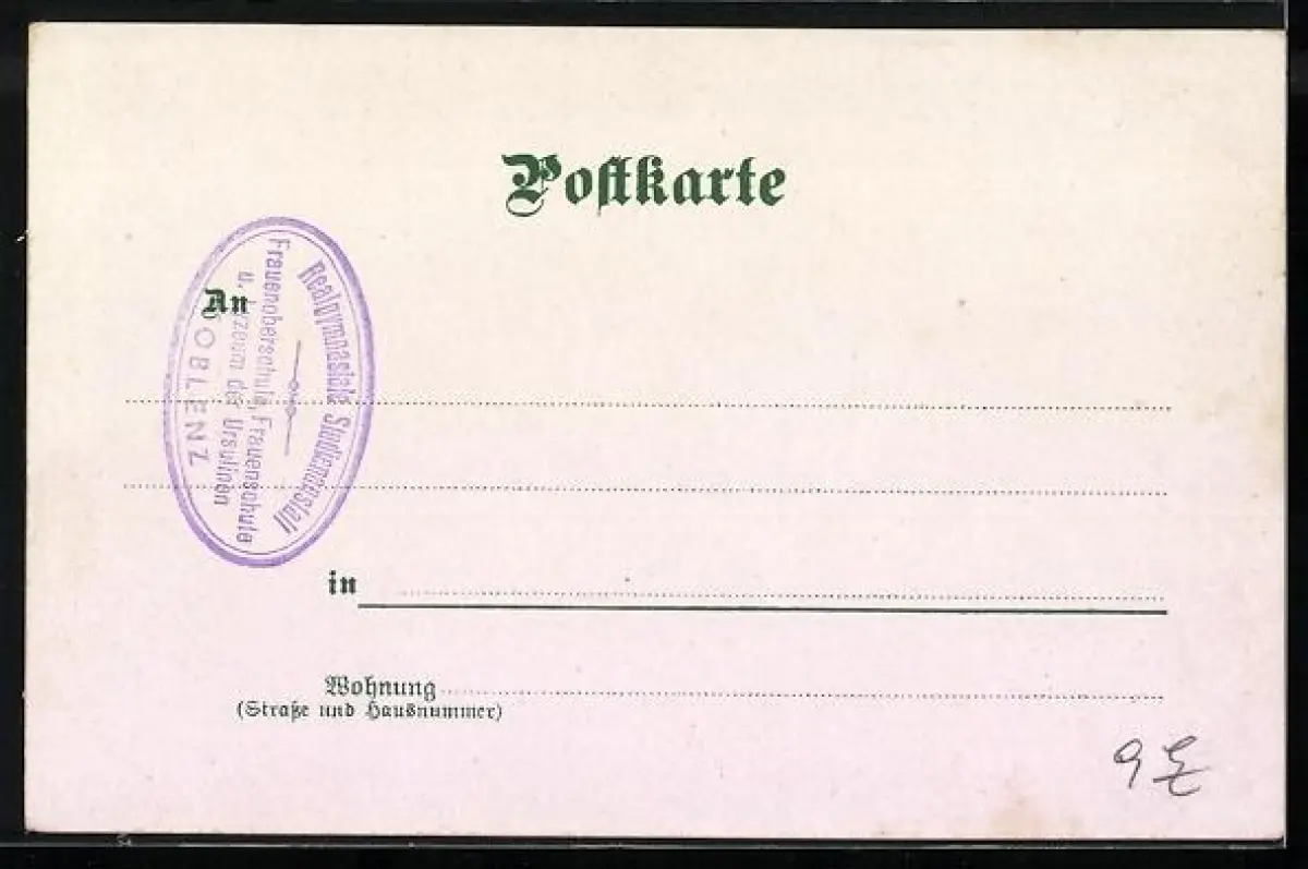Personenbezogene Daten auf der Rückseite der Karte wurden durch blauen Textmarker unkenntlich gemacht. Die blauen Stellen sind auf die Vorderseite durchgeweicht und wirken sich negativ auf das Postkartenfoto aus