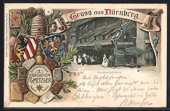 Lithographie Nürnberg, Gasthaus Bratwurstglöcklein, Nürnberger Lebkuchen F. G. Metzger, Bienenkorb, Imkerei