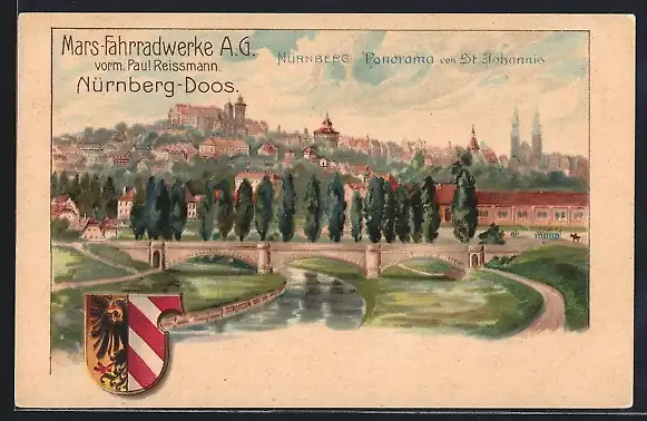 Lithographie Nürnberg, Panorama von St. Johannis, Doos, Wappen, Mars-Fahrradwerke AG vorm. Paul Reissmann