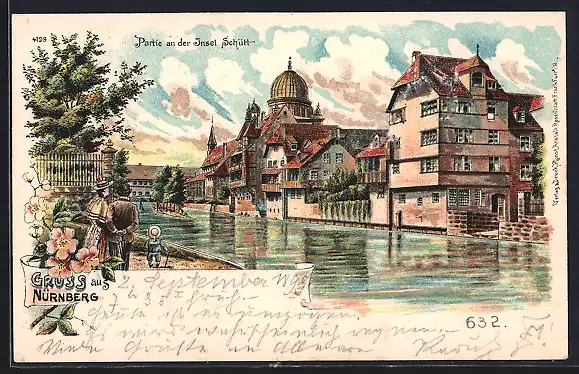 Lithographie Nürnberg, Partie an der Insel Schütt mit Synagoge