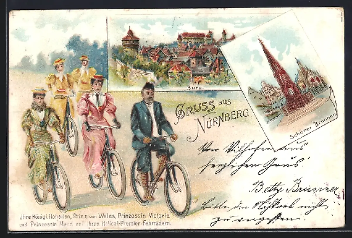 Lithographie Nürnberg, Prinz von Wales, Prinzessin Victoria und Prinzessin Maud auf ihren Helical-Premier-Fahhrädern