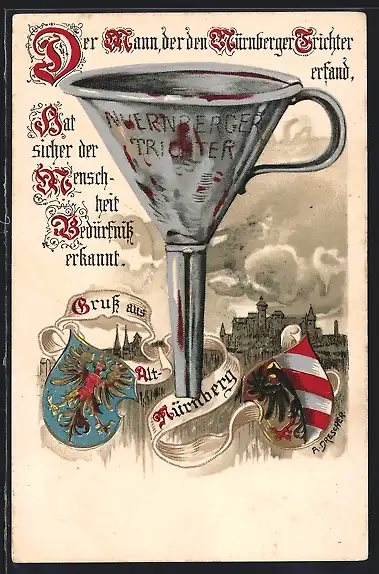 Lithographie Nürnberg, Stadtansicht mit Wappen und Trichter