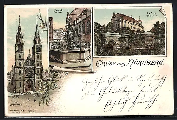 Lithographie Nürnberg, die Lorenzkirche, Tugendbrunnen, Westansicht der Burg