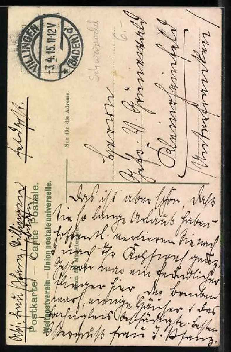 Personenbezogene Daten auf der Rückseite der Karte wurden durch blauen Textmarker unkenntlich gemacht. Die blauen Stellen sind auf die Vorderseite durchgeweicht und wirken sich negativ auf das Postkartenfoto aus
