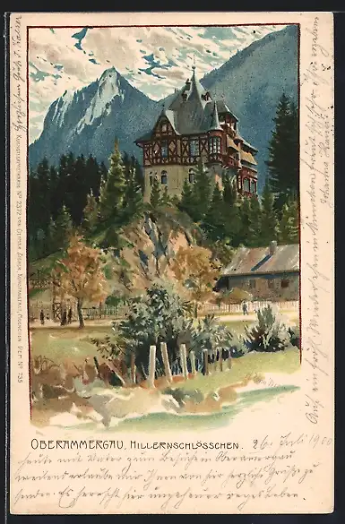 Lithographie Oberammergau, Blick auf das Hillernschlösschen